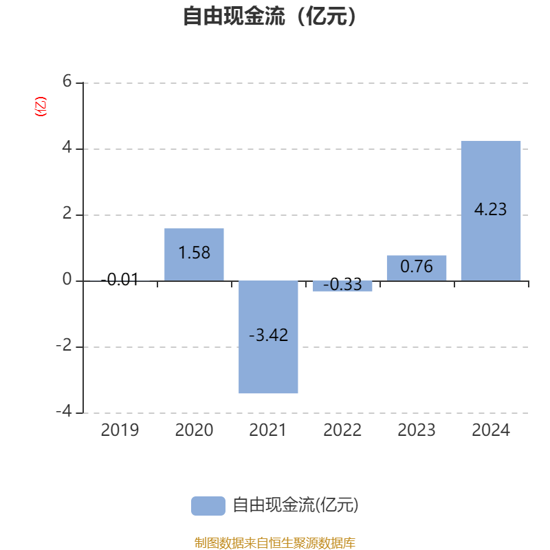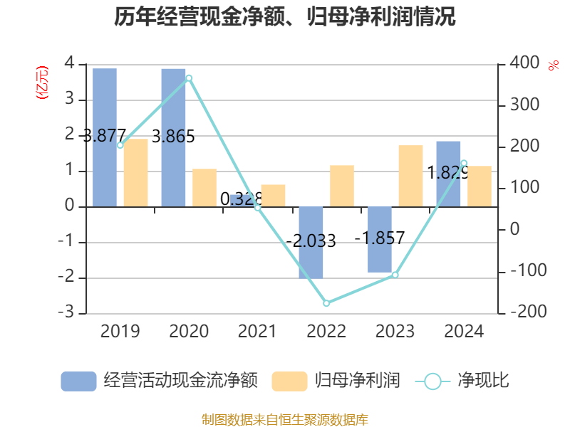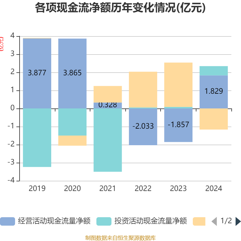 截至2024年,公司经营活动现金流净额为1.83亿元,同比增加3.69亿元;筹资活动现金流净额-1.17亿元,同比减少3.62亿元;投资活动现金流净额5127.64万元,上年同期为860.26万元。