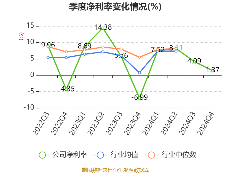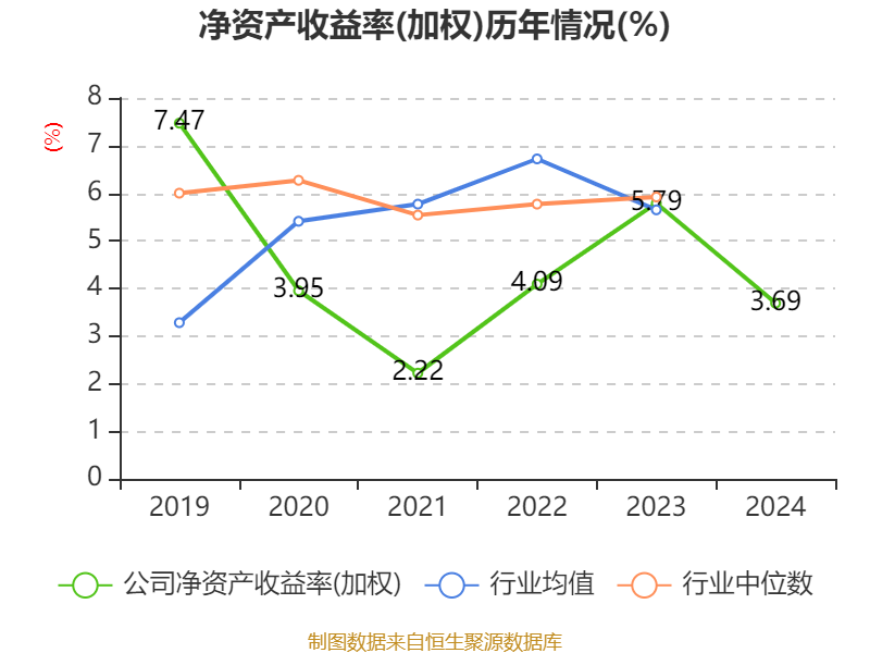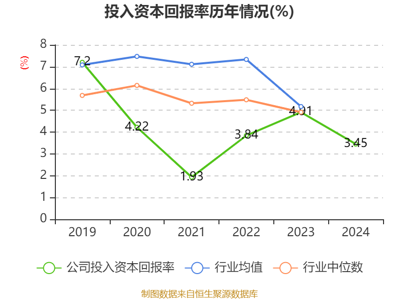 数据显示,2024年公司加权平均净资产收益率为3.69%,较上年同期下降2.1个百分点。公司2024年投入资本回报率为3.45%,较上年同期下降1.46个百分点。