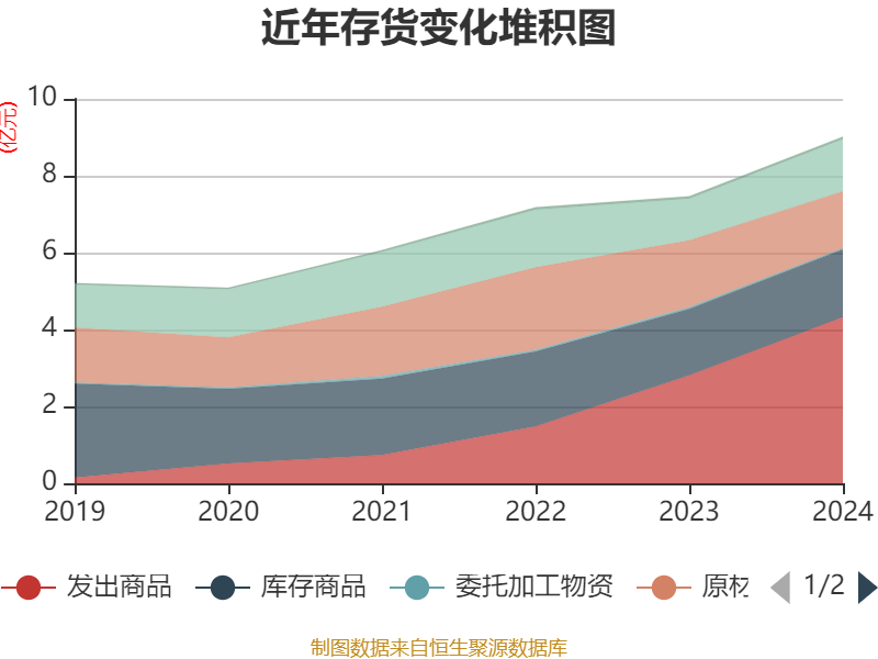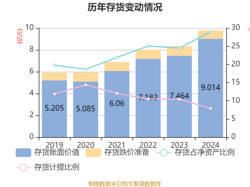 从存货变动来看,截至2024年末,公司存货账面价值为9.01亿元,占净资产的28.92%,较上年末增加1.55亿元。其中,存货跌价准备为7697.2万元,计提比例为7.87%。