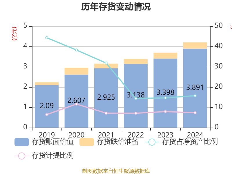 从存货变动来看,截至2024年末,公司存货账面价值为3.89亿元,占净资产的15.71%,较上年末增加4934.61万元。其中,存货跌价准备为3070.96万元,计提比例为7.31%。