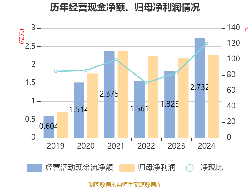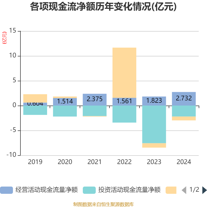 截至2024年,公司经营活动现金流净额为2.73亿元,同比增长49.87%;筹资活动现金流净额-7731.81万元,同比增加1085.09万元;投资活动现金流净额-2.21亿元,上年同期为-7.58亿元。