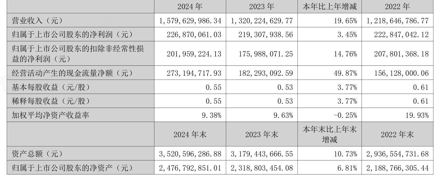 中证智能财讯鼎泰高科(301377)4月23日披露2024年年度报告。2024年,公司实现营业总收入15.8亿元,同比增长19.65%;归母净利润2.27亿元,同比增长3.45%;扣非净利润2.02亿元,同比增长14.76%;经营活动产生的现金流量净额为2.73亿元,同比增长49.87%;报告期内,鼎泰高科基本每股收益为0.55元,加权平均净资产收益率为9.38%。公司2024年度分配预案为:拟向全体股东每10股派现2.8元(含税)。