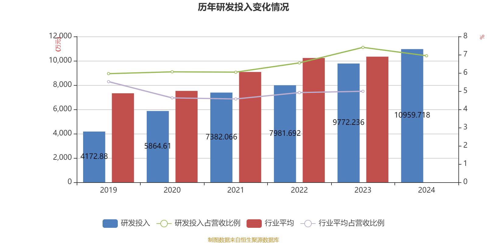 2024年全年,公司研发投入金额为1.1亿元,同比增长12.15%;研发投入占营业收入比例为6.94%,相比上年同期下降0.46个百分点。此外,公司全年研发投入资本化率为0%。