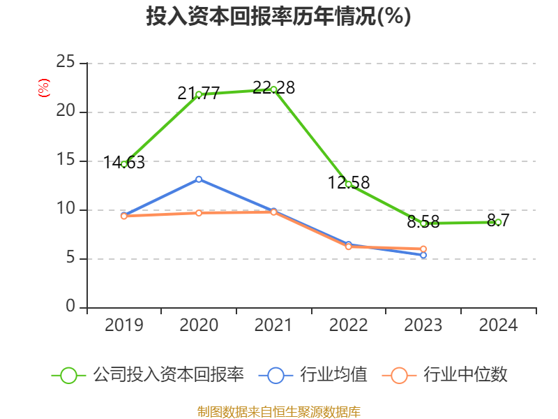 数据显示,2024年公司加权平均净资产收益率为9.38%,较上年同期下降0.25个百分点。公司2024年投入资本回报率为8.7%,较上年同期上升0.12个百分点。
