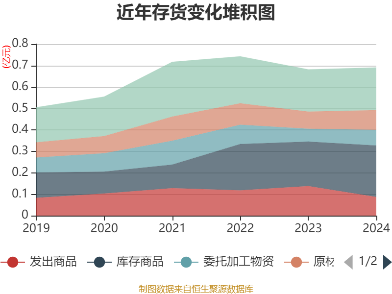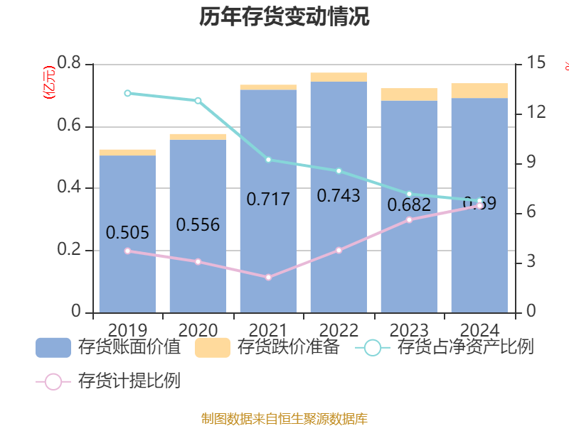 从存货变动来看,截至2024年末,公司存货账面价值为6902.61万元,占净资产的6.74%,较上年末增加79.66万元。其中,存货跌价准备为475.11万元,计提比例为6.44%。