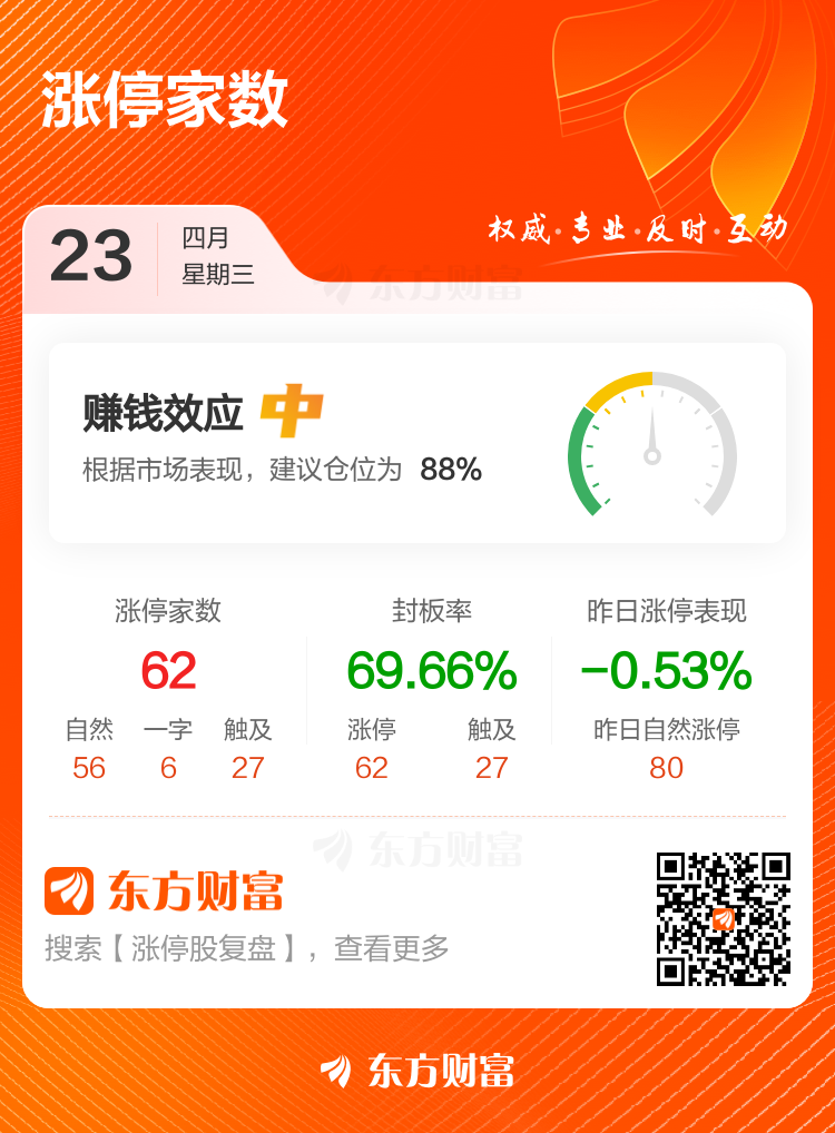 涨停个股数量方面,今日午盘共计62股涨停,另有27只个股盘中一度触及涨停,封板率69.66%。