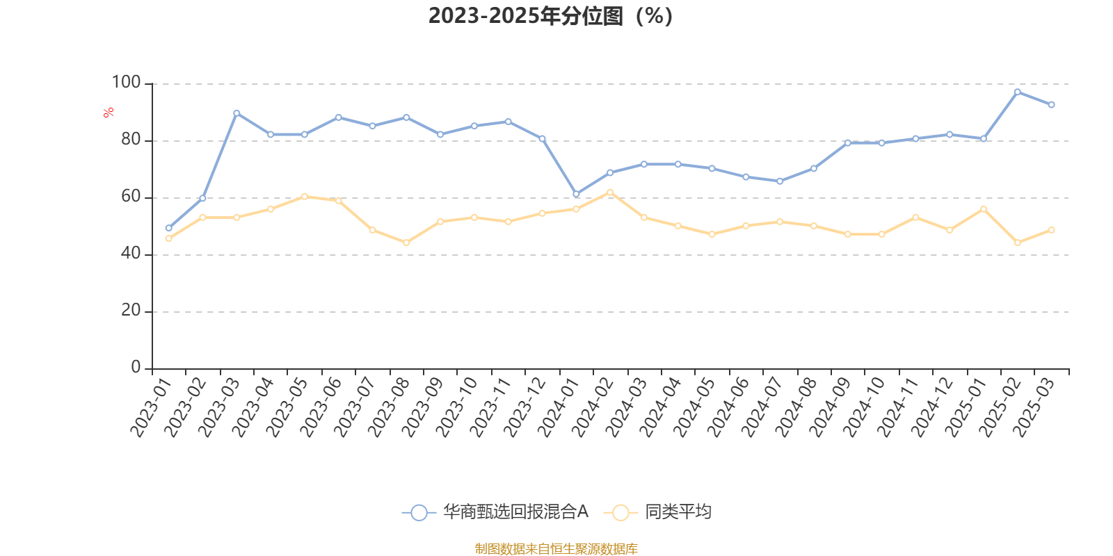 通过所选区间该基金净值增长率分位图,可以观察该基金与同类基金业绩比较情况。图为坐标原点到区间内某时点的净值增长率在同类基金中的分位数。