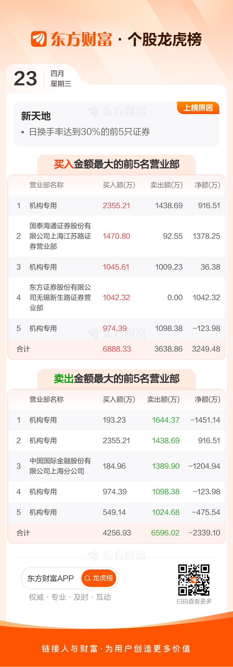 交易所2025年4月23日公布的交易公开信息显示,新天地因成为日换手率达到30%的前5只证券上榜。新天地当日收报12.79元,涨跌幅7.84%,偏离值51.10%,换手率51.10%,成交额6.84亿。