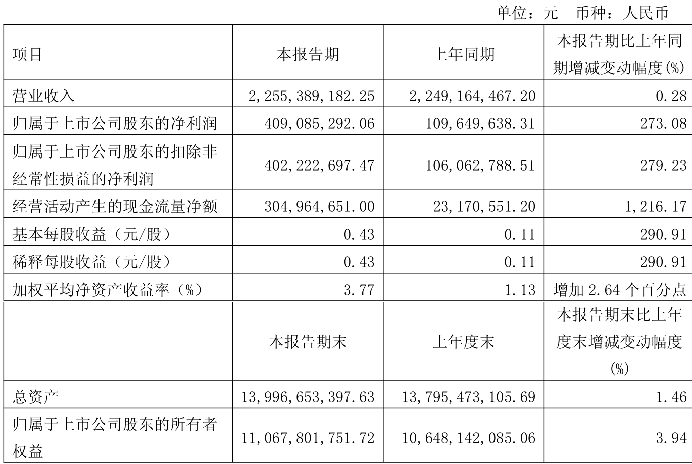 中证智能财讯浙江医药(600216)4月24日披露2025年第一季度报告。公司实现营业总收入22.55亿元,同比增长0.28%;归母净利润4.09亿元,同比增长273.08%;扣非净利润4.02亿元,同比增长279.23%;经营活动产生的现金流量净额为3.05亿元,同比增长1216.17%;报告期内,浙江医药基本每股收益为0.43元,加权平均净资产收益率为3.77%。