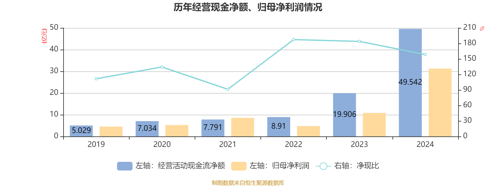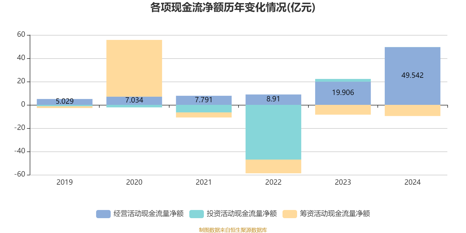 2024年,公司经营活动现金流净额为49.54亿元,同比增长148.88%;筹资活动现金流净额-9.59亿元,同比减少1.17亿元;投资活动现金流净额895.7万元,上年同期为2.34亿元。