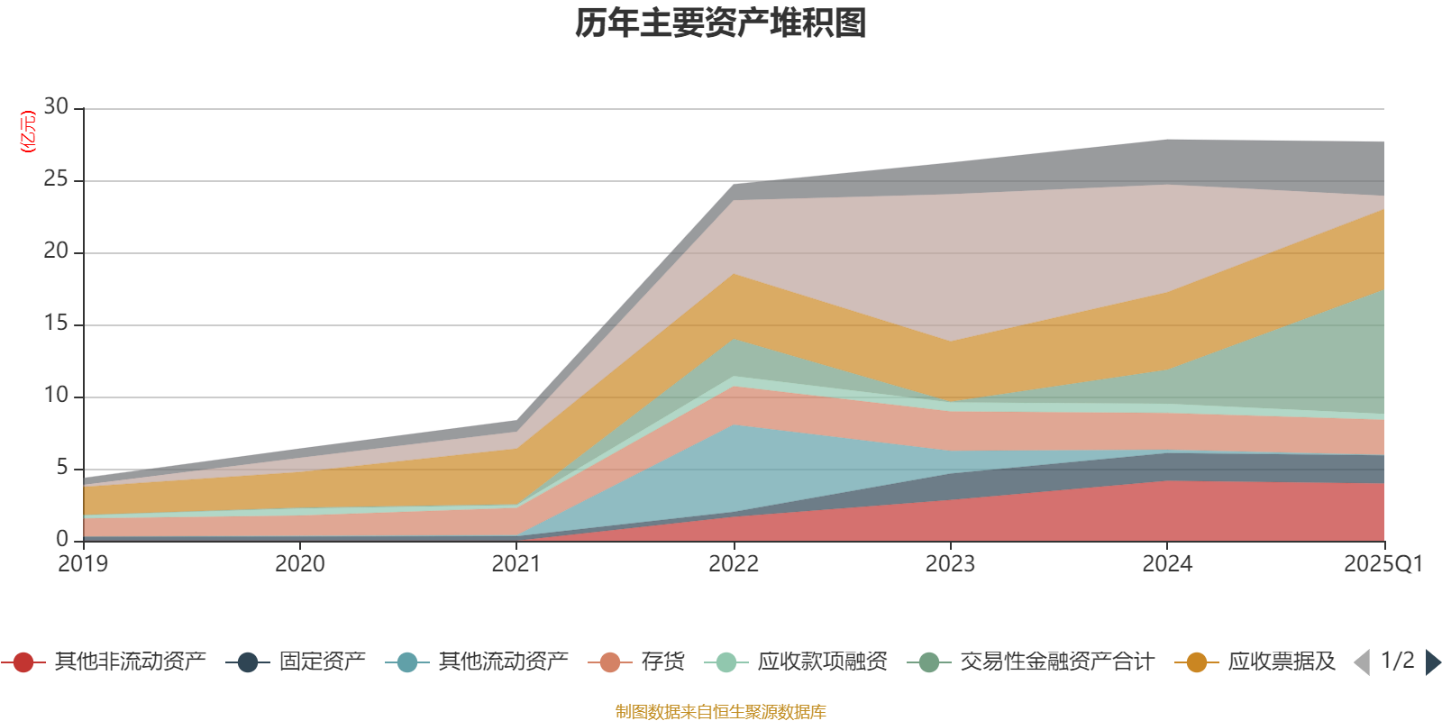 资产重大变化方面,截至2025年一季度末,公司货币资金较上年末减少87.72%,占公司总资产比重下降23.54个百分点;交易性金融资产合计较上年末增加267.25%,占公司总资产比重上升22.75个百分点;其他权益工具投资较上年末增加95.89%,占公司总资产比重上升1.02个百分点;应收款项融资较上年末减少36.39%,占公司总资产比重下降0.83个百分点。