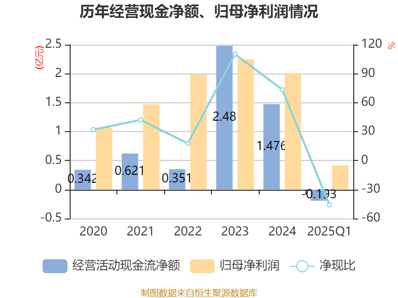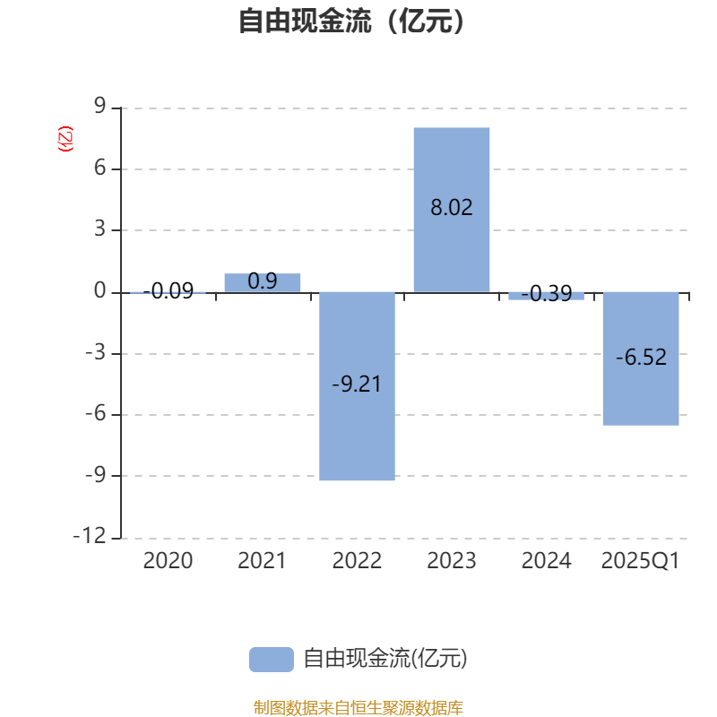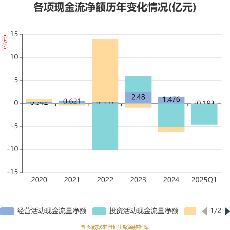 截至2025年一季度末,公司经营活动现金流净额为-1925.87万元,同比减少5130.72万元;筹资活动现金流净额-93.63万元,同比增加2250.24万元;投资活动现金流净额-4.4亿元,上年同期为-8.72亿元。