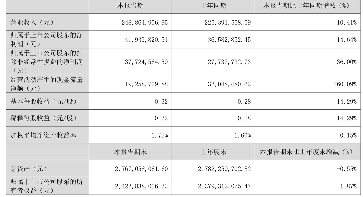 中证智能财讯北路智控(301195)4月24日披露2025年第一季度报告。公司实现营业总收入2.49亿元,同比增长10.41%;归母净利润4193.98万元,同比增长14.64%;扣非净利润3772.46万元,同比增长36.00%;经营活动产生的现金流量净额为-1925.87万元,上年同期为3204.85万元;报告期内,北路智控基本每股收益为0.32元,加权平均净资产收益率为1.75%。