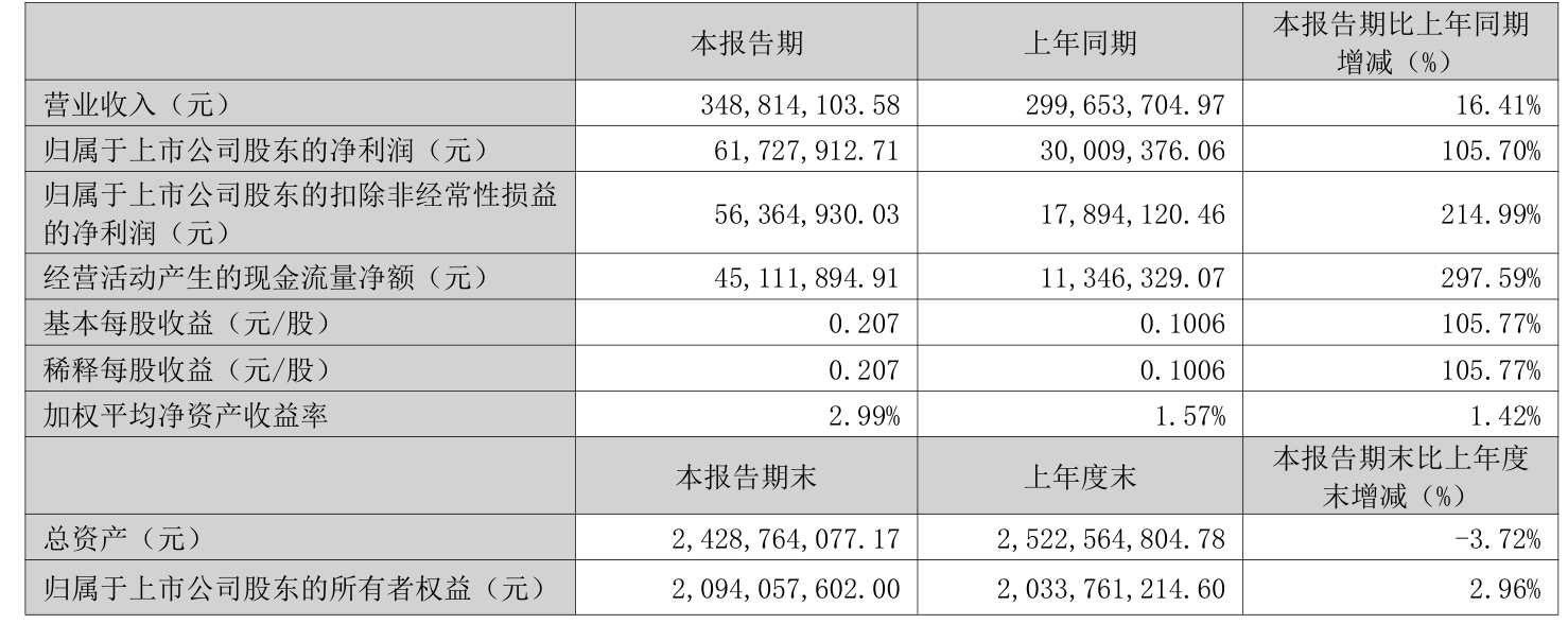 中证智能财讯中石科技(300684)4月24日披露2025年第一季度报告。公司实现营业总收入3.49亿元,同比增长16.41%;归母净利润6172.79万元,同比增长105.70%;扣非净利润5636.49万元,同比增长214.99%;经营活动产生的现金流量净额为4511.19万元,同比增长297.59%;报告期内,中石科技基本每股收益为0.207元,加权平均净资产收益率为2.99%。