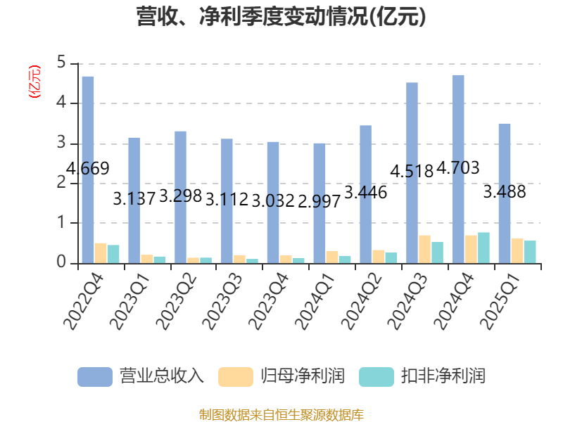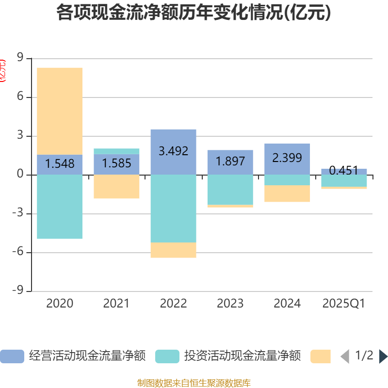截至2025年一季度末,公司经营活动现金流净额为4511.19万元,同比增长297.59%;筹资活动现金流净额-1603.95万元,同比减少1476.82万元;投资活动现金流净额-9412.03万元,上年同期为-9375.64万元。