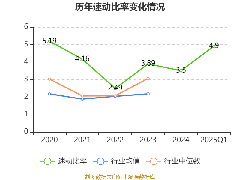 2025年第一季度,公司流动比率为5.38,速动比率为4.9。