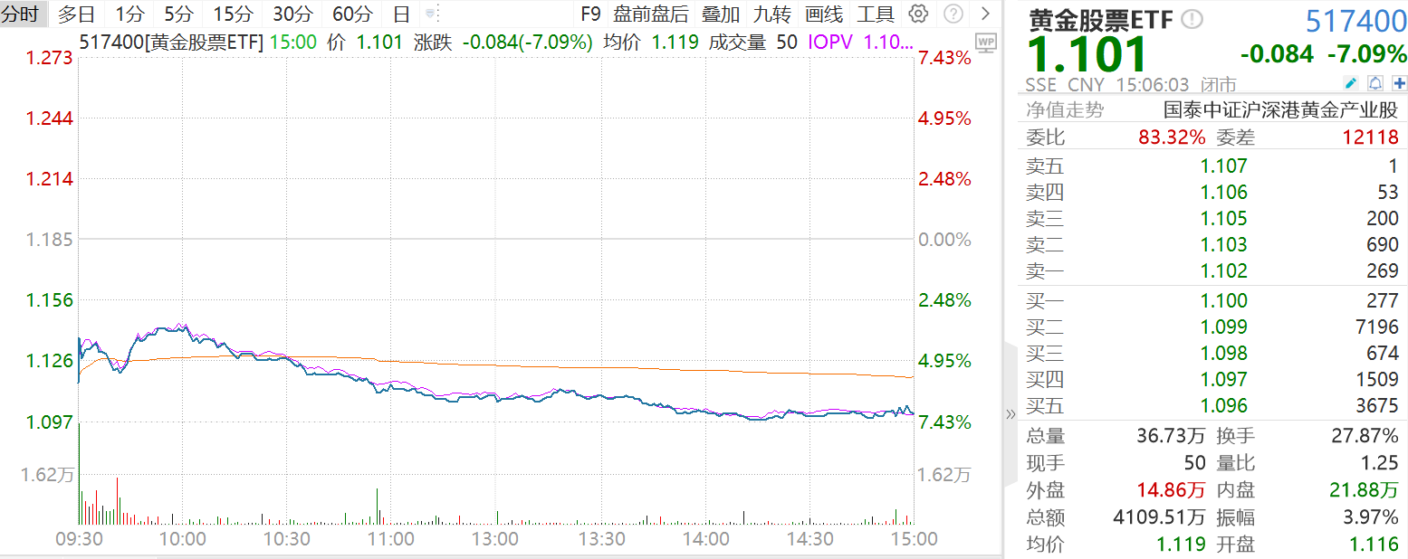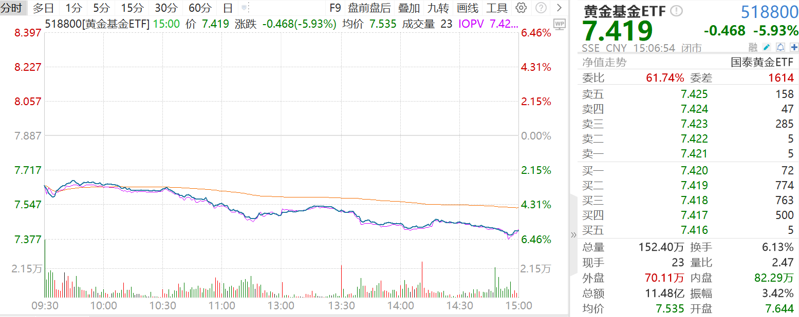 黄金股票ETF(517400)收盘下跌7.09%、黄金基金ETF(518800)收跌5.93%