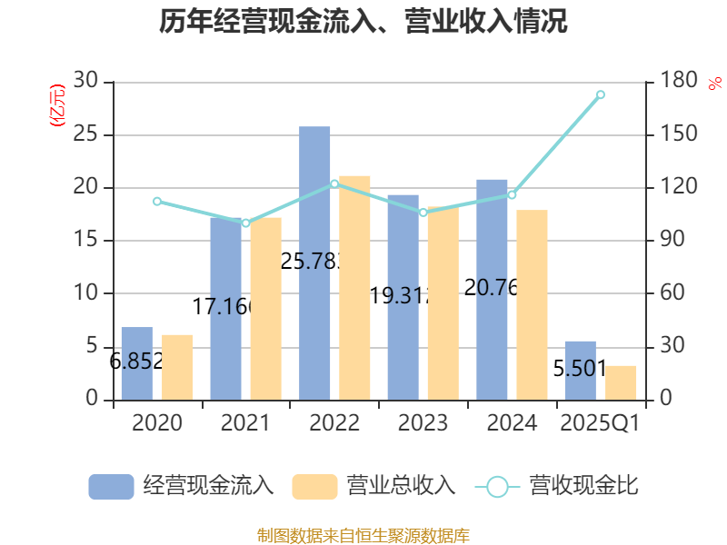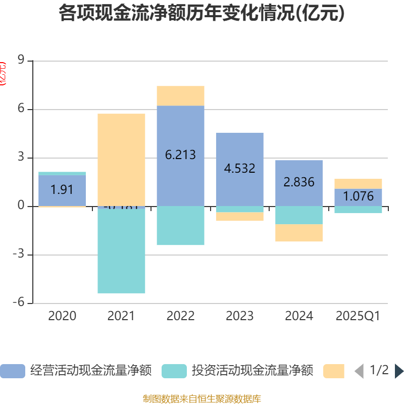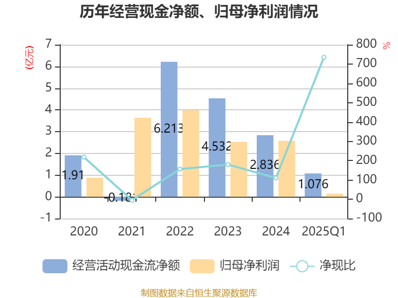 截至2025年一季度末,公司经营活动现金流净额为1.08亿元,同比下降22.16%;筹资活动现金流净额6092.26万元,同比增加1.21亿元;投资活动现金流净额-4364.49万元,上年同期为3232.63万元。