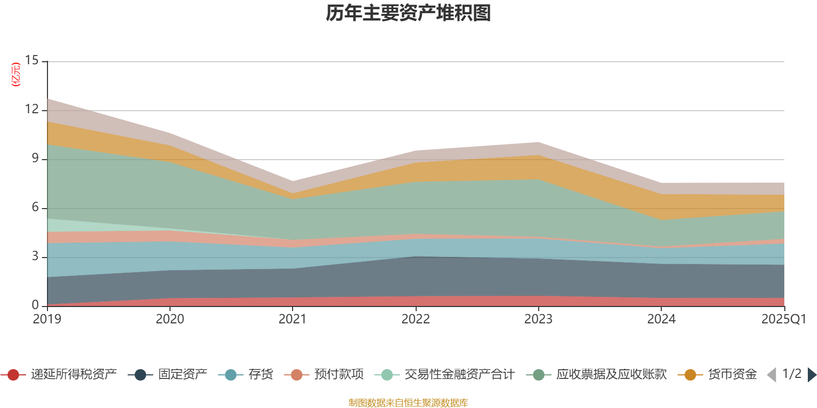 资产重大变化方面,截至2025年一季度末,公司货币资金较上年末减少35.37%,占公司总资产比重下降7.46个百分点;存货较上年末增加35.67%,占公司总资产比重上升4.51个百分点;预付款项较上年末增加176.69%,占公司总资产比重上升2.45个百分点;固定资产较上年末减少2.73%,占公司总资产比重下降0.8个百分点。