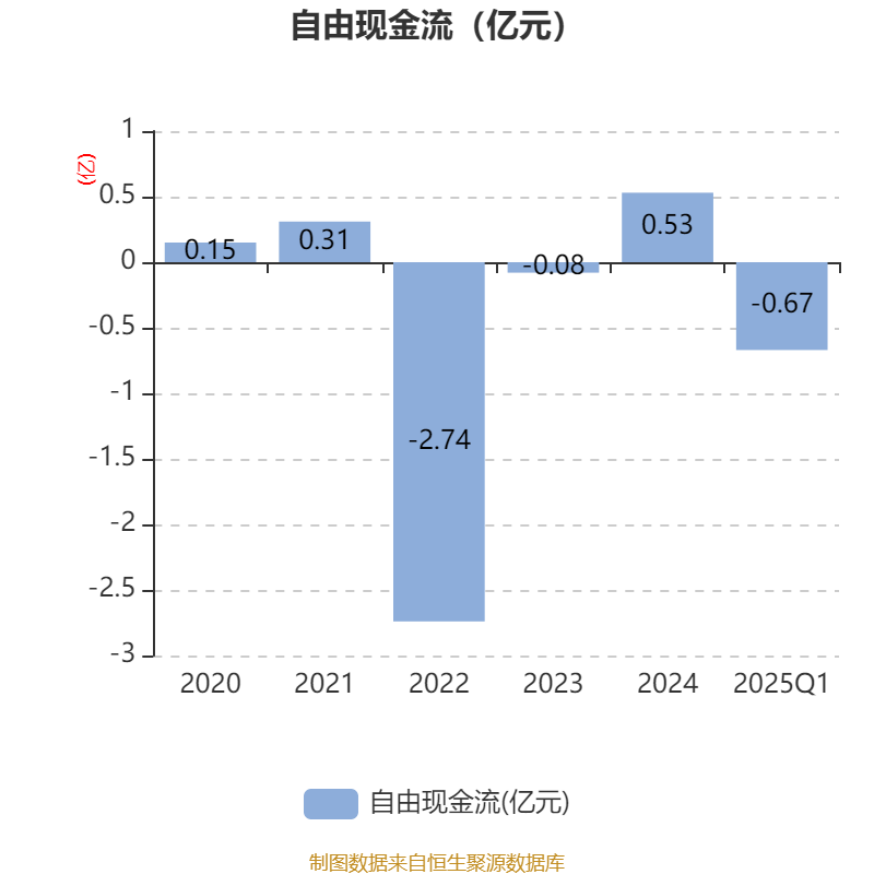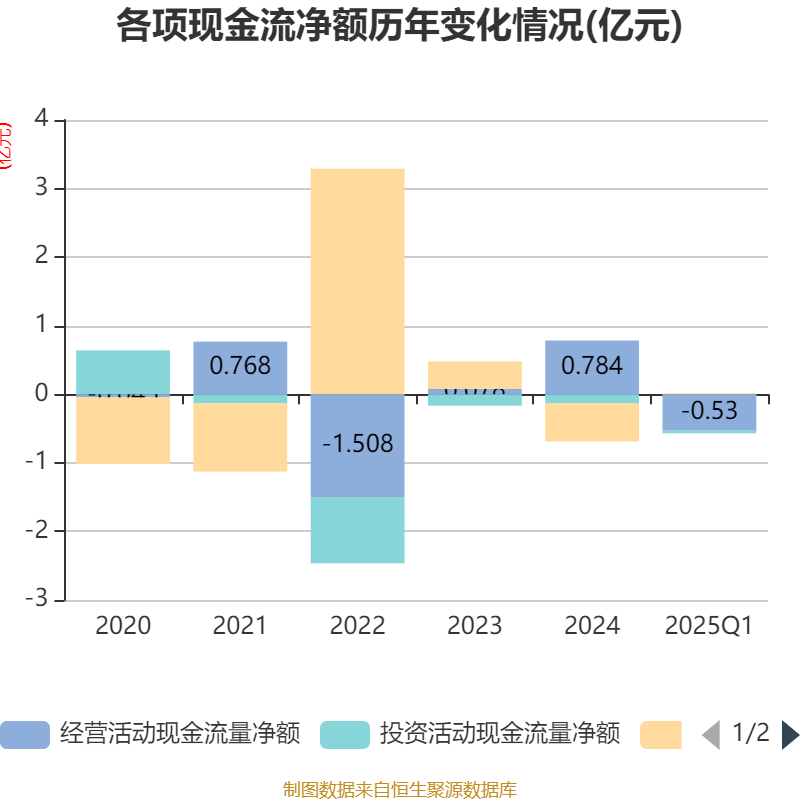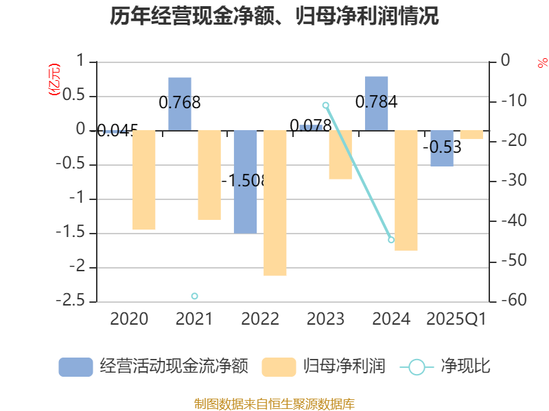 截至2025年一季度末,公司经营活动现金流净额为-5299.41万元,同比减少2536.65万元;筹资活动现金流净额139.88万元,同比增加293.8万元;投资活动现金流净额-389.63万元,上年同期为-718.28万元。