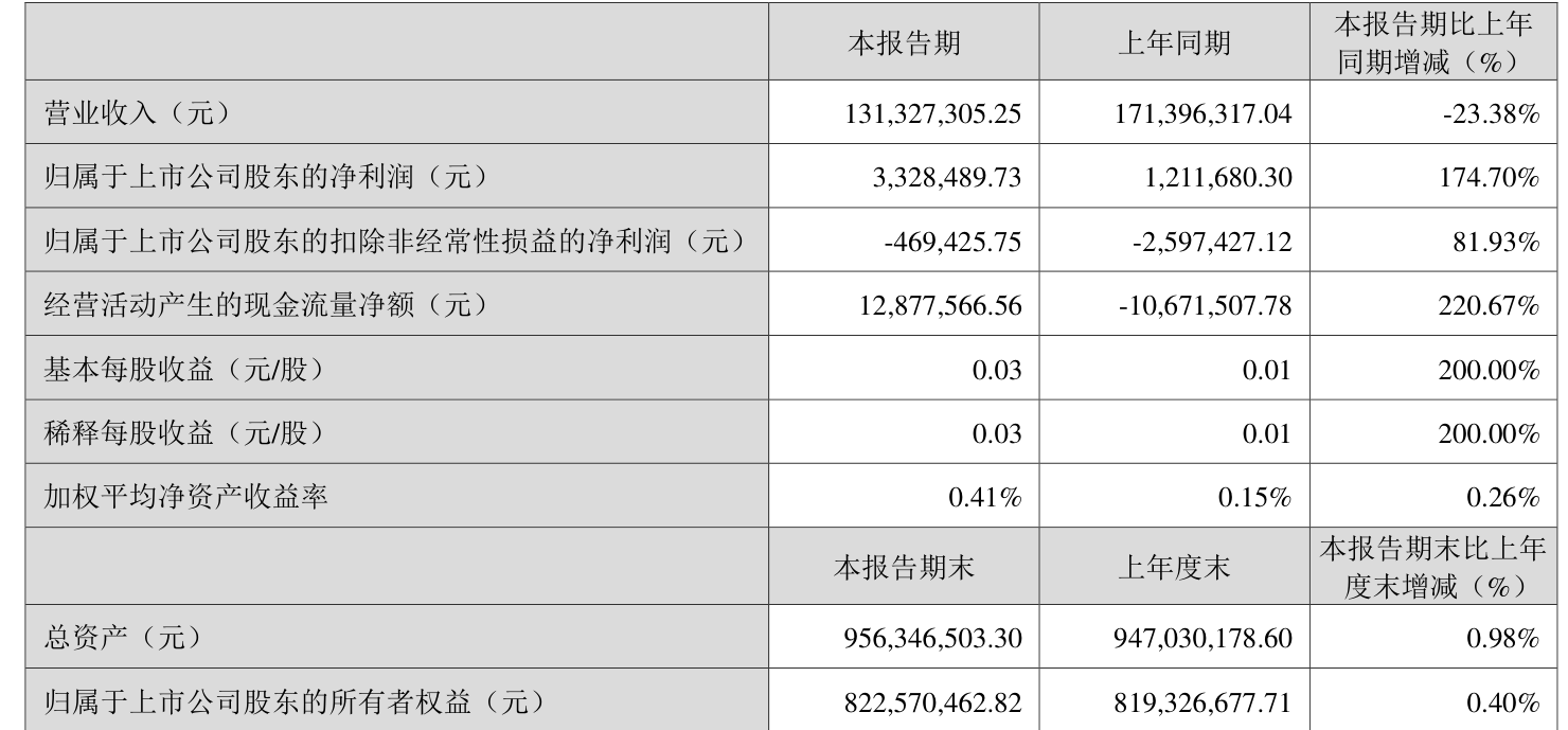 中证智能财讯南凌科技(300921)4月24日披露2025年第一季度报告。公司实现营业总收入1.31亿元,同比下降23.38%;归母净利润332.85万元,同比增长174.70%;扣非净利润亏损46.94万元,上年同期亏损259.74万元;经营活动产生的现金流量净额为1287.76万元,上年同期为-1067.15万元;报告期内,南凌科技基本每股收益为0.03元,加权平均净资产收益率为0.41%。