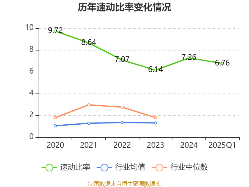 2025年第一季度,公司流动比率为6.88,速动比率为6.76。