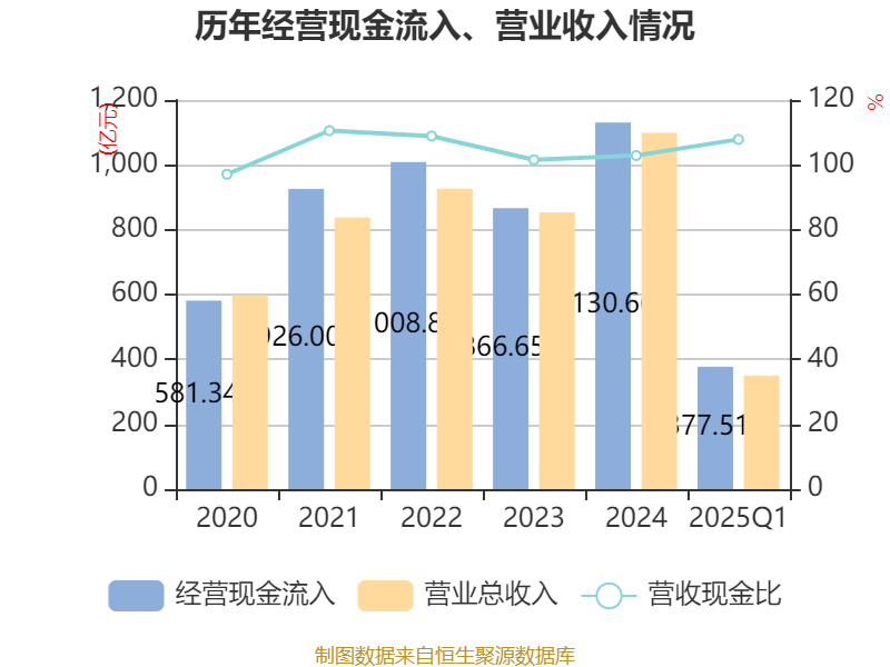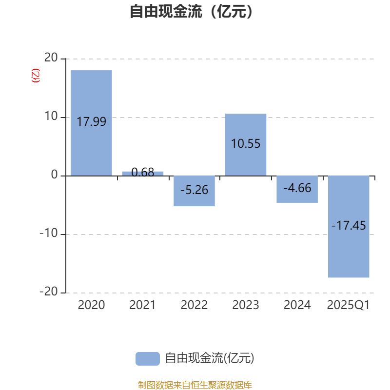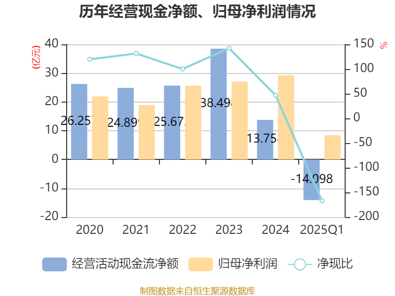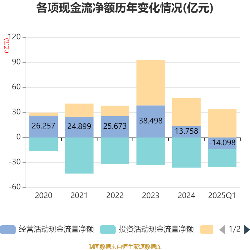 截至2025年一季度末,公司经营活动现金流净额为-14.1亿元,同比减少24亿元;筹资活动现金流净额33.91亿元,同比增加40.23亿元;投资活动现金流净额-21.49亿元,上年同期为-2.35亿元。