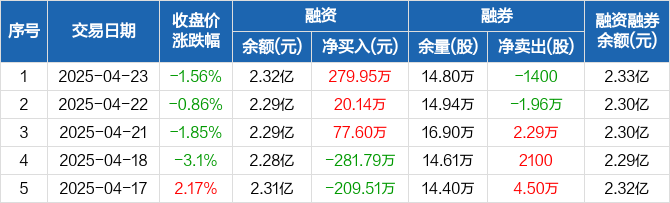 融资方面,当日融资买入1825.73万元,融资偿还1545.78万元,融资净买入279.95万元,连续3日净买入累计377.7万元。融券方面,融券卖出3900股,融券偿还5300股,融券余量14.8万股,融券余额84.21万元。融资融券余额合计2.33亿元。