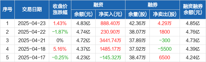 融资方面,当日融资买入4664.43万元,融资偿还3776.03万元,融资净买入888.4万元,连续4日净买入累计6046.21万元。融券方面,融券卖出6.2万股,融券偿还1.91万股,融券余量42.36万股,融券余额180.45万元。融资融券余额合计4.85亿元。
