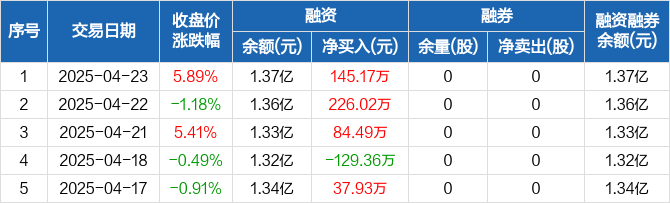 融资方面,当日融资买入528.89万元,融资偿还383.72万元,融资净买入145.17万元,连续3日净买入累计455.68万元。融券方面,融券卖出0股,融券偿还0股,融券余量0股,融券余额0元。融资融券余额合计1.37亿元。