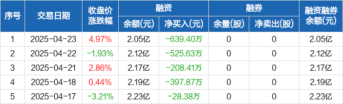 融资方面,当日融资买入2044.74万元,融资偿还2684.14万元,融资净偿还639.4万元,连续7日净偿还累计2520.04万元。融券方面,融券卖出0股,融券偿还0股,融券余量0股,融券余额0元。融资融券余额合计2.05亿元。