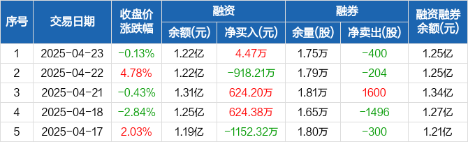 融资方面,当日融资买入1878.32万元,融资偿还1873.85万元,融资净买入4.47万元。融券方面,融券卖出100股,融券偿还500股,融券余量1.75万股,融券余额270.69万元。融资融券余额合计1.25亿元。