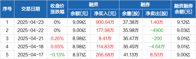 融资方面,当日融资买入1903.53万元,融资偿还1002.9万元,融资净买入900.64万元,连续7日净买入累计1853.15万元。融券方面,融券卖出1.45万股,融券偿还500股,融券余量37.38万股,融券余额291.19万元。融资融券余额合计9.12亿元。