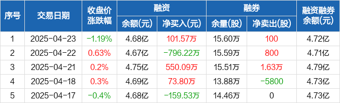 融资方面,当日融资买入1257.62万元,融资偿还1156.04万元,融资净买入101.57万元。融券方面,融券卖出100股,融券偿还0股,融券余量15.6万股,融券余额467.38万元。融资融券余额合计4.72亿元。