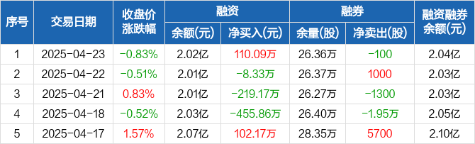 融资方面,当日融资买入621.08万元,融资偿还510.98万元,融资净买入110.09万元。融券方面,融券卖出200股,融券偿还300股,融券余量26.36万股,融券余额252.57万元。融资融券余额合计2.04亿元。