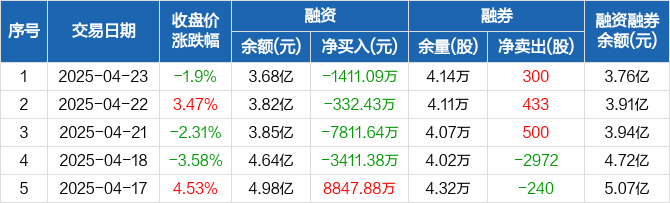 融资方面,当日融资买入3927.56万元,融资偿还5338.65万元,融资净偿还1411.09万元,连续4日净偿还累计1.3亿元。融券方面,融券卖出300股,融券偿还0股,融券余量4.14万股,融券余额832.35万元。融资融券余额合计3.76亿元。