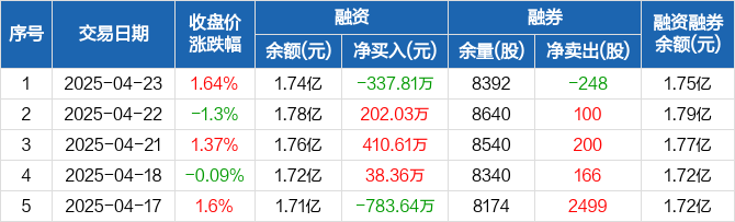 融资方面,当日融资买入902.46万元,融资偿还1240.27万元,融资净偿还337.81万元。融券方面,融券卖出200股,融券偿还448股,融券余量8392股,融券余额91.05万元。融资融券余额合计1.75亿元。