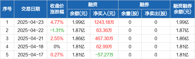 融资方面,当日融资买入2352.96万元,融资偿还1109.78万元,融资净买入1243.18万元,连续4日净买入累计1836.83万元。融券方面,融券卖出0股,融券偿还0股,融券余量0股,融券余额0元。融资融券余额合计1.99亿元。