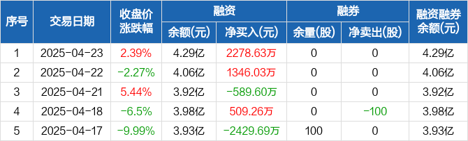 融资方面,当日融资买入4380.4万元,融资偿还2101.77万元,融资净买入2278.63万元。融券方面,融券卖出0股,融券偿还0股,融券余量0股,融券余额0元。融资融券余额合计4.29亿元。