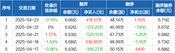融资方面,当日融资买入1663.16万元,融资偿还1244.64万元,融资净买入418.51万元。融券方面,融券卖出1.19万股,融券偿还400股,融券余量48.14万股,融券余额497.77万元。融资融券余额合计6.71亿元。