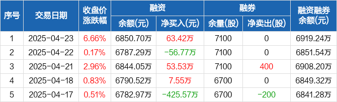 嘉益股份融资融券信息显示,2025年4月23日融资净买入63.42万元;融资余额6850.7万元,较前一日增加0.93%