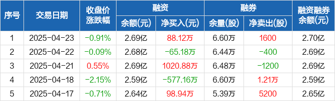 融资方面,当日融资买入1089.2万元,融资偿还1001.09万元,融资净买入88.12万元。融券方面,融券卖出1600股,融券偿还0股,融券余量6.6万股,融券余额71.68万元。融资融券余额合计2.7亿元。