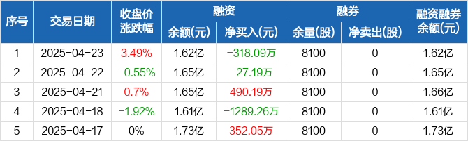 融资方面,当日融资买入1497.09万元,融资偿还1815.18万元,融资净偿还318.09万元。融券方面,融券卖出0股,融券偿还0股,融券余量8100股,融券余额6.01万元。融资融券余额合计1.62亿元。