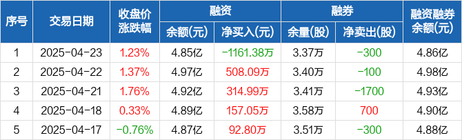 融资方面,当日融资买入1902.12万元,融资偿还3063.49万元,融资净偿还1161.38万元。融券方面,融券卖出100股,融券偿还400股,融券余量3.37万股,融券余额105.75万元。融资融券余额合计4.86亿元。