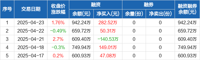 融资方面,当日融资买入376.45万元,融资偿还93.92万元,融资净买入282.52万元。融券方面,融券卖出0份,融券偿还0份,融券余量0份,融券余额0元。融资融券余额合计942.24万元。