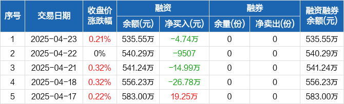 融资方面,当日融资买入14.26万元,融资偿还18.99万元,融资净偿还4.74万元,连续4日净偿还累计47.45万元。融券方面,融券卖出0份,融券偿还0份,融券余量0份,融券余额0元。融资融券余额合计535.55万元。