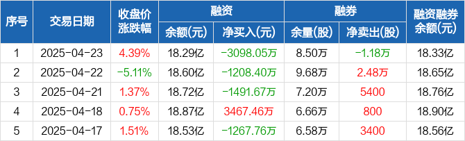 融资方面,当日融资买入1.33亿元,融资偿还1.64亿元,融资净偿还3098.05万元,连续3日净偿还累计5798.12万元。融券方面,融券卖出6400股,融券偿还1.82万股,融券余量8.5万股,融券余额410.38万元。融资融券余额合计18.33亿元。