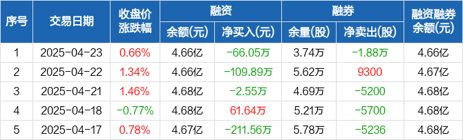 融资方面,当日融资买入1193.61万元,融资偿还1259.66万元,融资净偿还66.05万元,连续3日净偿还累计178.49万元。融券方面,融券卖出0股,融券偿还1.88万股,融券余量3.74万股,融券余额39.76万元。融资融券余额合计4.66亿元。