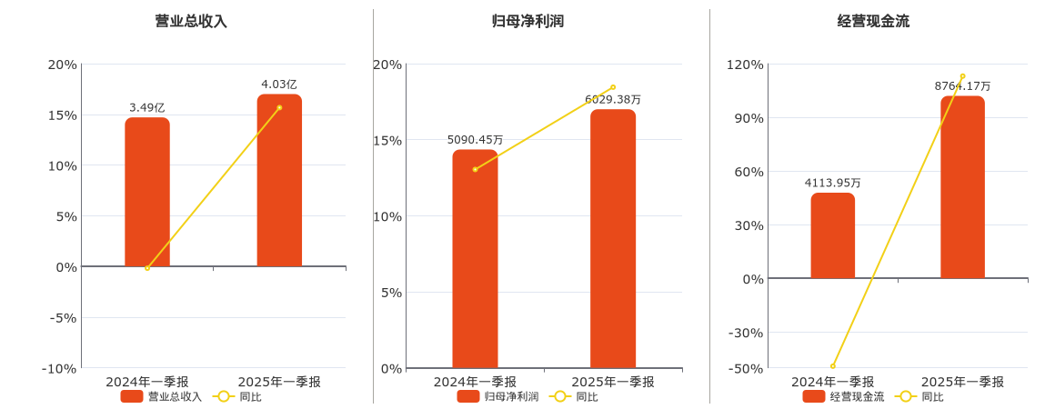 公司营业总收入为4.03亿元。归母净利润为6029.38万元。经营活动现金净流入为8764.17万元。