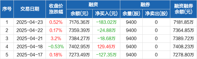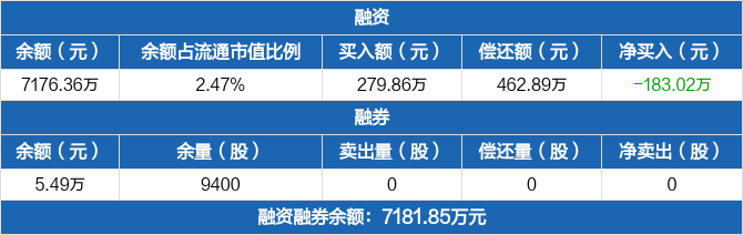 融资方面,当日融资买入279.86万元,融资偿还462.89万元,融资净偿还183.02万元,连续3日净偿还累计226.58万元。融券方面,融券卖出0股,融券偿还0股,融券余量9400股,融券余额5.49万元。融资融券余额合计7181.85万元。